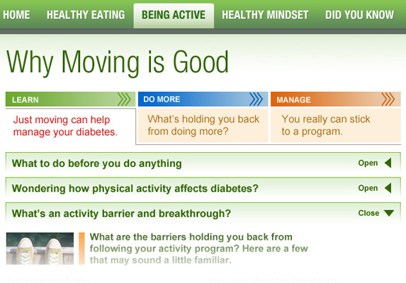 | Client: BMS & Astra Zeneca | Web tools for diabetes help - Info pages' interface | Involvement: original concept, art direction, UX design, wireframes, design, graphics