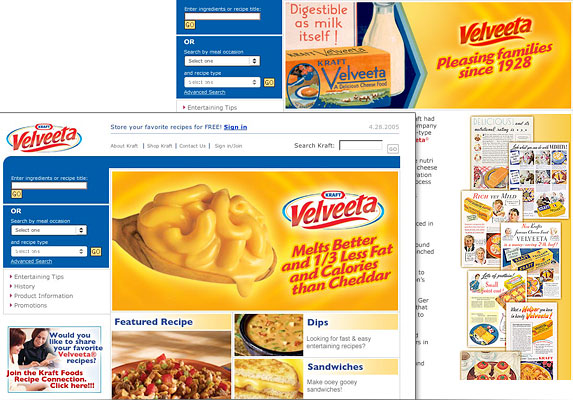 | Client: Kraft Foods, Tarrytown, NY | Velveeta mini site | Involvement: Design, production, code | Click here or on the image to see the page