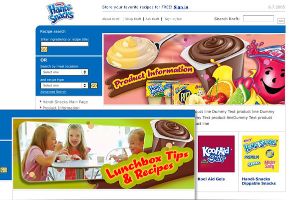 | Client: Kraft Foods, Tarrytown, NY | Handi-Snacks mini site | Involvement: Design, production, code | Click here or on the image to see the page