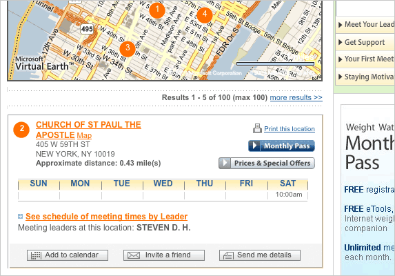 | Client: Weight Watchers, New York, NY | Visitor's site - global meeting finder | Involvement: art direction, design | Click here or on the image to see the page at Weightwatchers.com